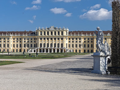 När man är i Wien är ett besök på Schönbrunn förmodligen obligatoriskt. Vi dock kom dit innan säsongen börjat, innan blommorna i rabatterna planterats och allt det gröna slagit ut.Men en plats som den här kan naturligtvis inte dölja sin storslagenhet.Det kejserliga lustslottet från 1700-talets början har en 160 hektar stor park i fransk stil, ett växthus som Crystal Palace i London och egen djurpark, som fortfarande finns kvar.Och givetvis den pampiga paviljongen Gloriette (som numera är ett överdådigt kafé).När monarkin avskaffades 1918 tog österrikiska staten över ägande, byggnaderna och parken är sedan 1996 på UNESCO.s världsarvslista och är ett synnerligen välbesökt turistmål.När vi var där var det dock inte särskilt mycket folk, möjligtvis på grund av årstiden och dessutom var det ganska kyligt för att vara april i Wien.När planerna på slottet började skissas i slutet av 1600-talet var tanken att det skulle överträffa Versailles i Paris, men kejsardömet Österrike-Ungern fick nöja sig med ett något blygsammare projekt...som dock inte på något sätt är blygsamt ändå.